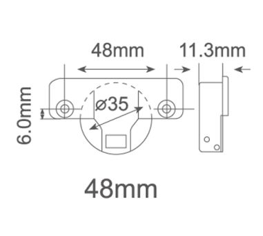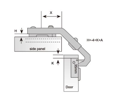 Open degree: 135° Height of hinge cup: 11.3mm Diameter of hinge cup: 35mm Distance from door edge to the cup (K): 3-7mm Recommend door thickness: 14-23mm